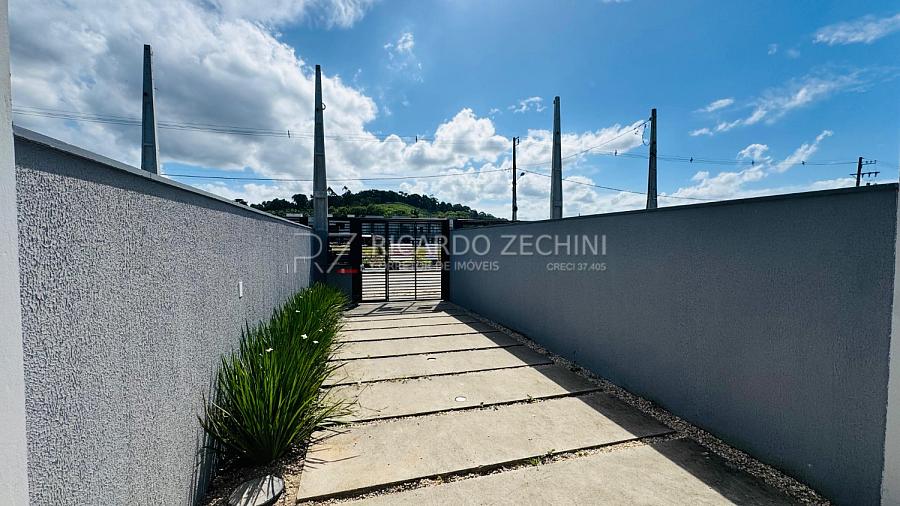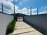 - Jardim e garagem frontal com canteiros e calçada em placas de concreto